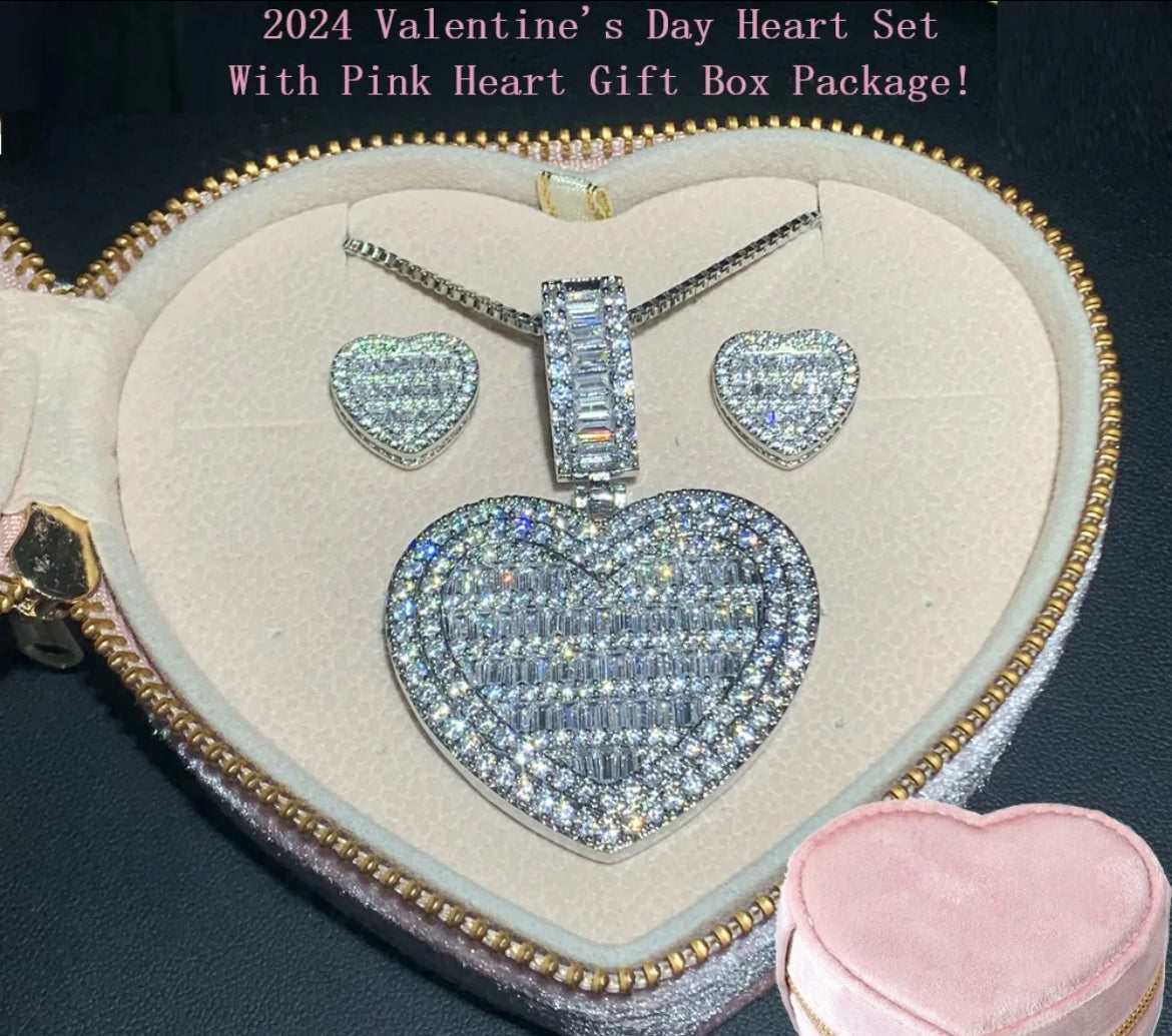 Heart Shaped earrings and necklace available in silver and gold. Comes with velvet pink jewelry box.